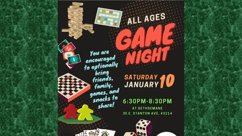 Game Night for all Ages: Invite your family, friends, and neighbors! Optionally bring snacks or your favorite games to share. 6:30pm in the Great Hall.