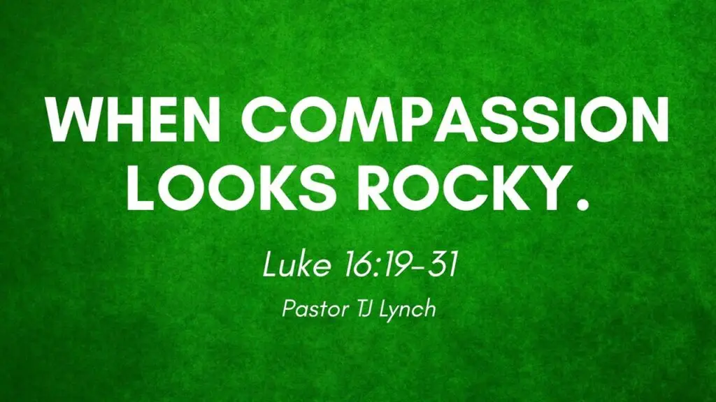 Luke 16:19-31 From Pastor TJ’s sermon titled “When Compassion Looks Rocky”. “Compassion isn’t optional in the Kingdom of God” – Pastor TJ Lynch https://www.youtube.com/watch?v=IRAf-NGhNvU
