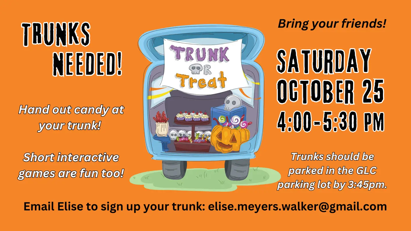 Join us for our annual Halloween fun. Anyone interested in hosting a trunk should contact the church office. |