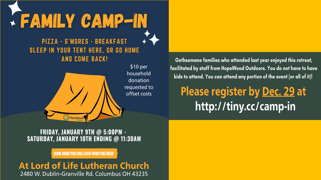 Lord of Life 2480 W Granville Road, Columbus, OH, United StatesFamily Camp-In at Lord of Life! All are invited to attend! GLC folks that attended last year really enjoyed this event, which is facilitated by staff from HopeWood Outdoors. There will be pizza & s’mores, songs, devotions, and fellowship! There is an “adult devotion/Bible study” on Saturday morning too! “Come when you can, leave when you […]